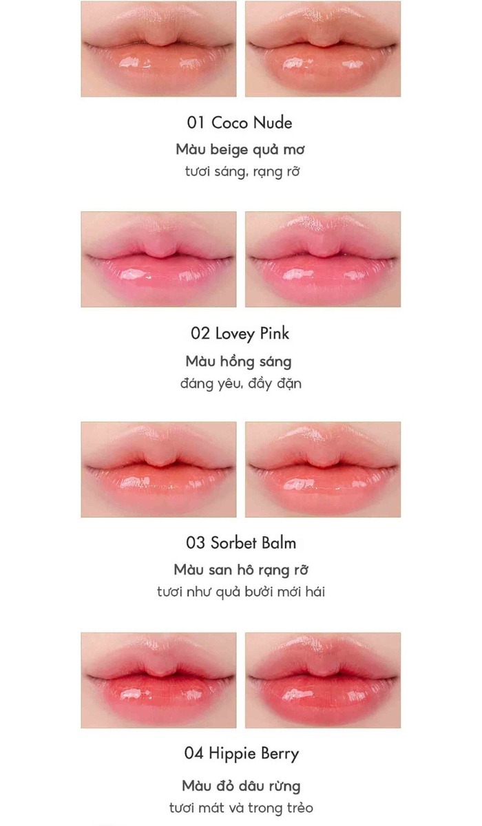 - Sản phẩm dưỡng môi kết hợp màu sắc: Son dưỡng Romand Glasting Melting Balm mang đến những màu sắc tươi mới, giống với các dòng son tint, giúp bạn tạo điểm nhấn hoàn hảo cho đôi môi mà không cần phải lo lắng về độ dưỡng ẩm.