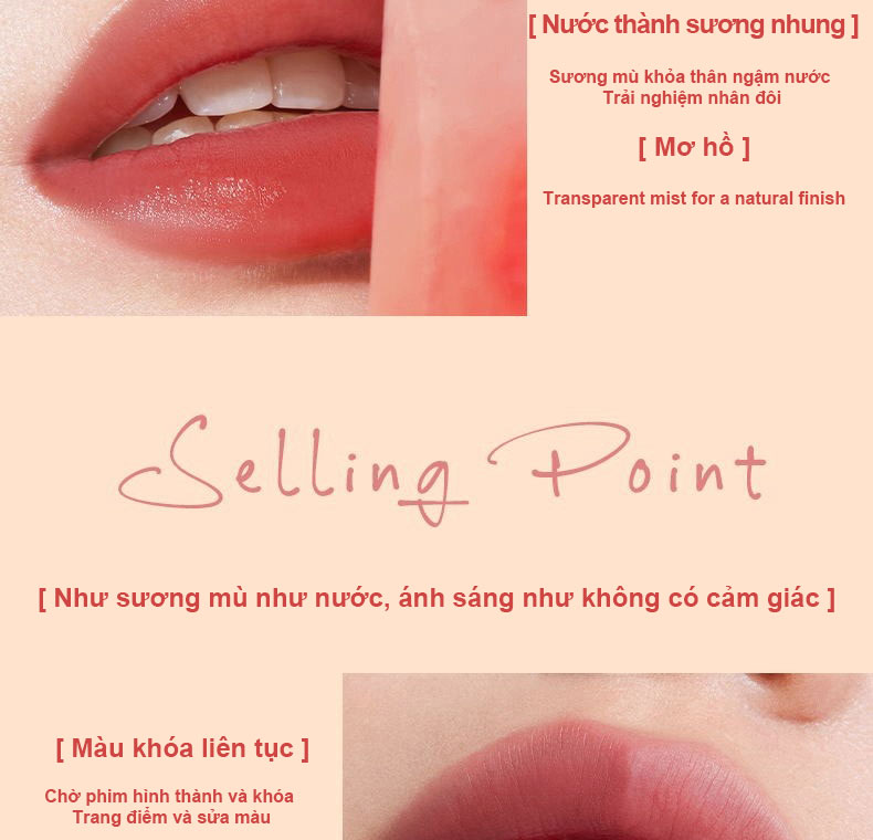 Sản phẩm tạo ra lớp trang điểm thoáng khí như không khí, giúp đôi môi luôn mịn màng và tươi mới. Khả năng giữ lớp trang điểm tốt, không dễ bị dính vào cốc, mang đến sự tự tin suốt cả ngày dài.