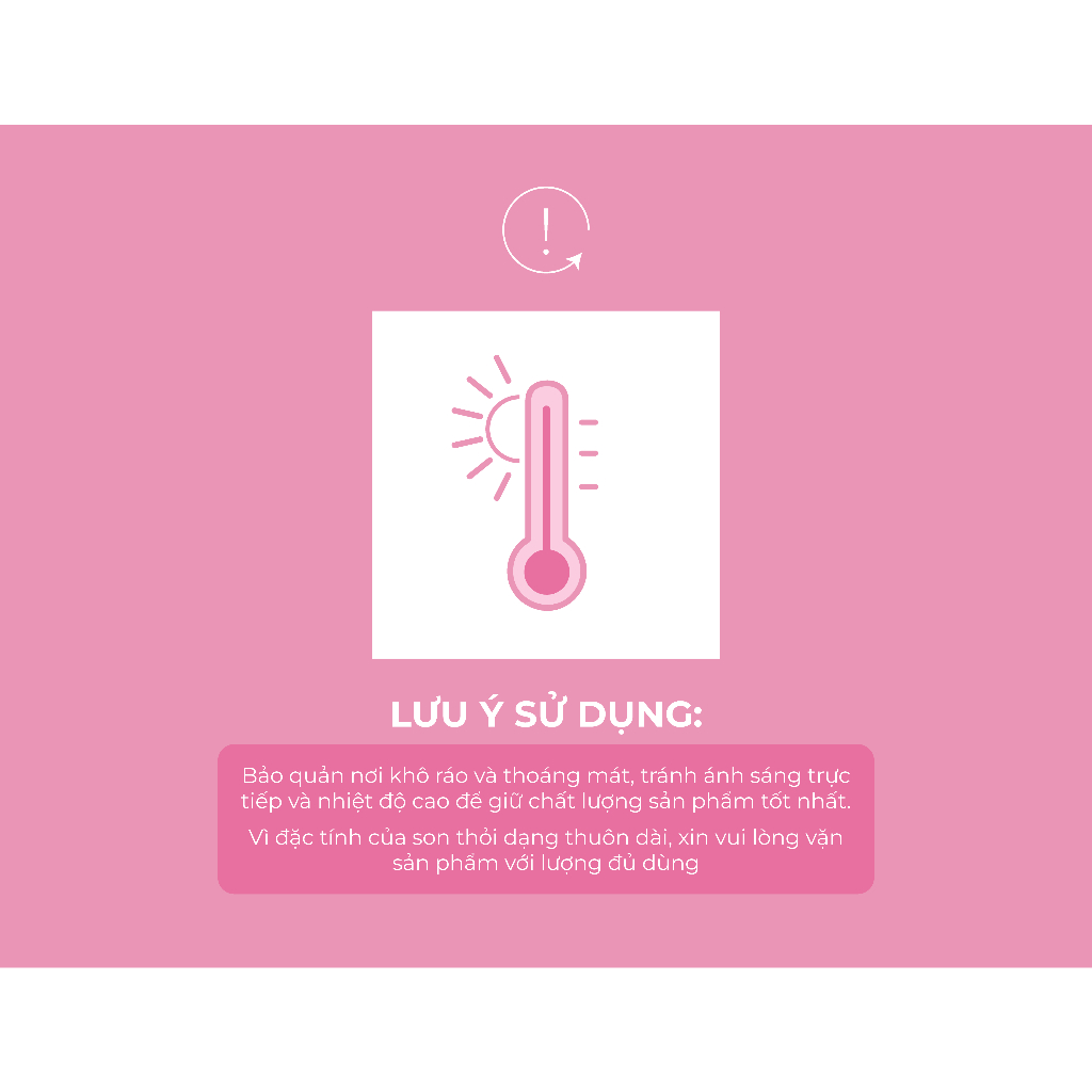 – Hướng dẫn sử dụng: Chất son mềm,đánh 1 lớp để son nhẹ nhàng,đánh full môi để son được đậm màu