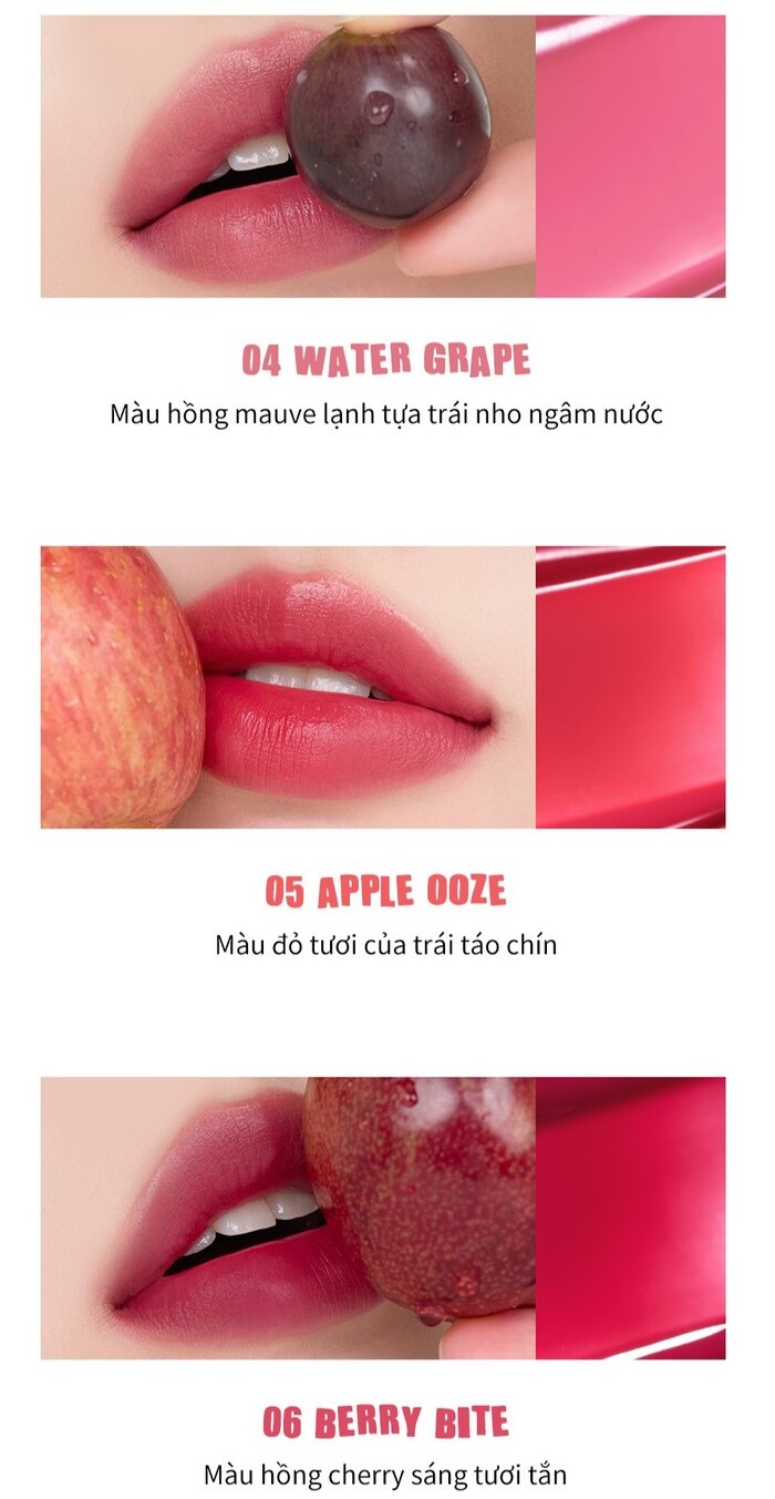 - Bảng màu đa dạng: Lấy cảm hứng từ nước ép quả mọng, phù hợp với nhiều tone da.