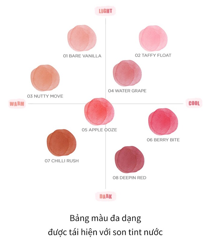 Romand Bare Water Tint mang đến 8 sắc màu tuyệt đẹp, phù hợp với nhiều tone da: