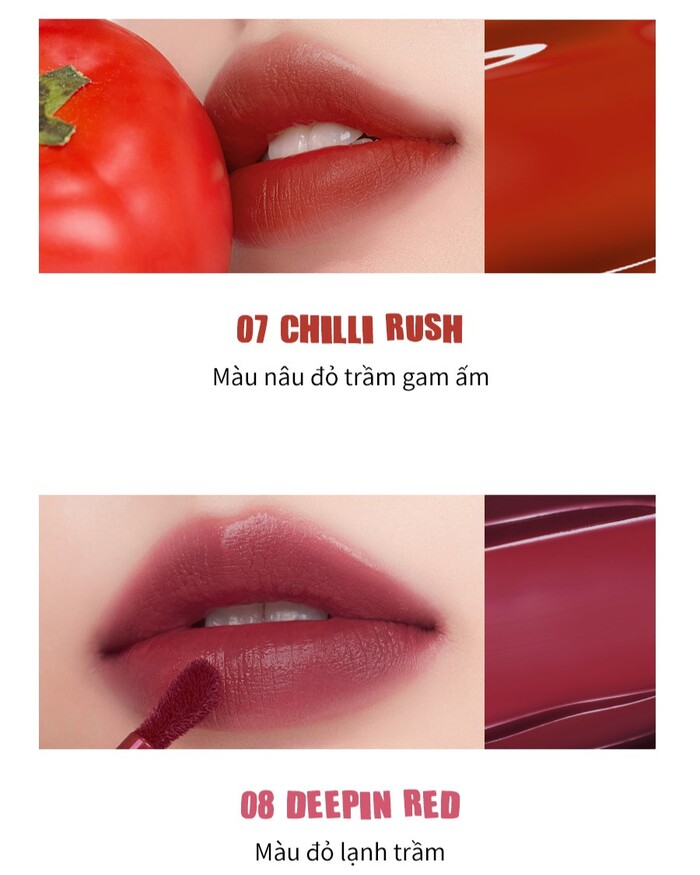 - Chất son nước mỏng nhẹ: Thẩm thấu nhanh, tiệp vào môi ngay khi tán.