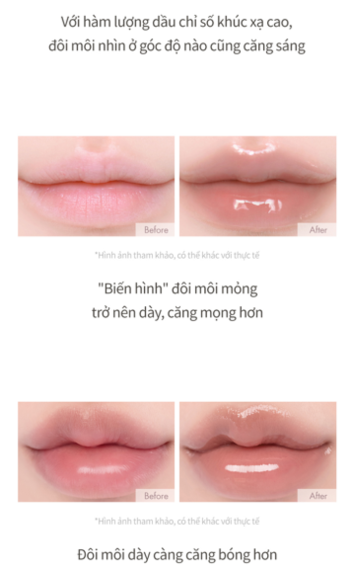 - Đôi môi trở nên căng mọng và bóng sáng nhờ hàm lượng dầu có chỉ số khúc xạ cao.