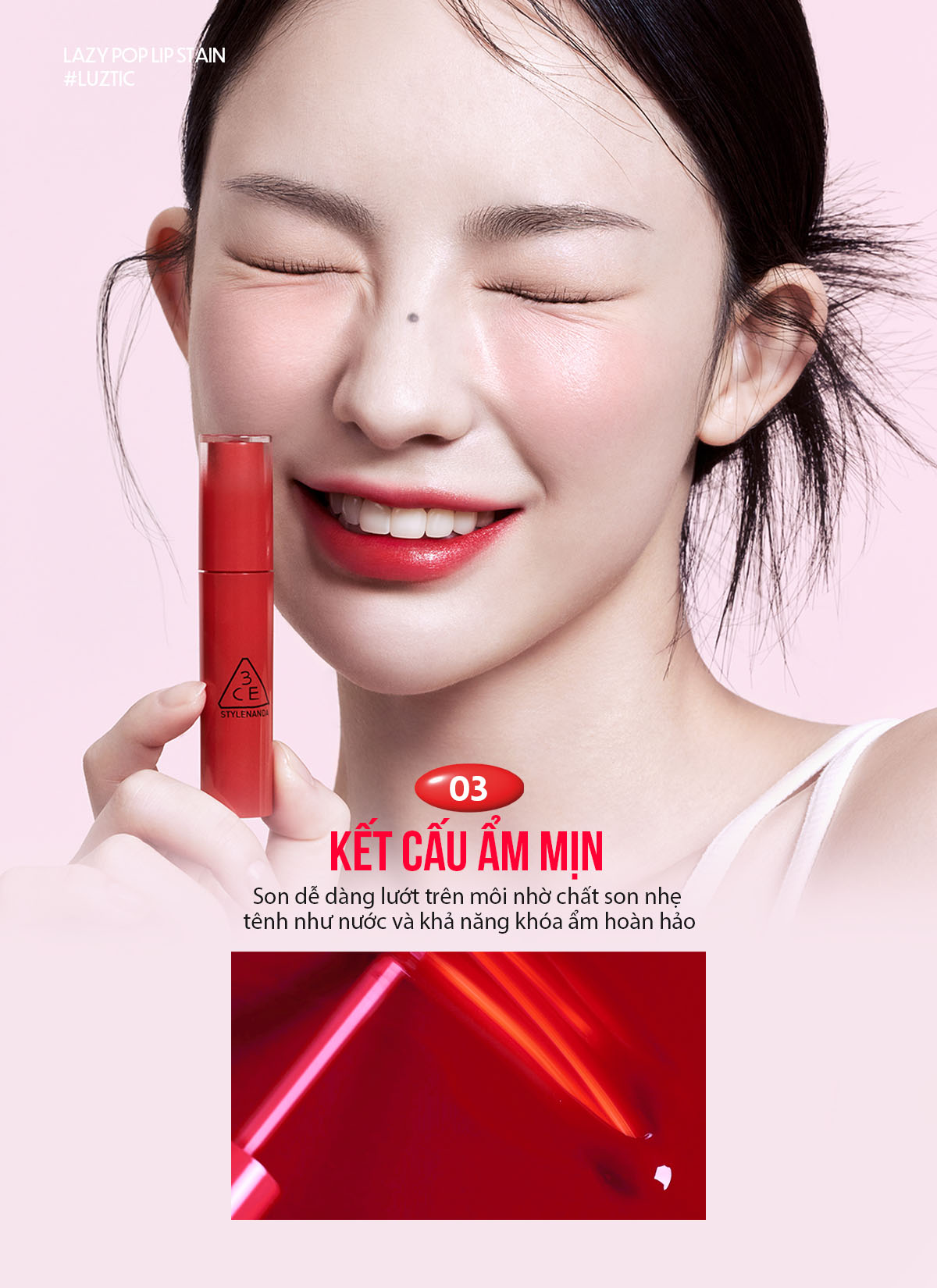 Dòng 3CE Lazy Pop Lip Stain 4.5g tiếp tục kế thừa và nâng cấp thế mạnh của dòng son tint 3CE: giữ màu lâu – nhẹ môi – dưỡng ẩm tốt, xứng đáng có mặt trong túi trang điểm của mọi cô gái.