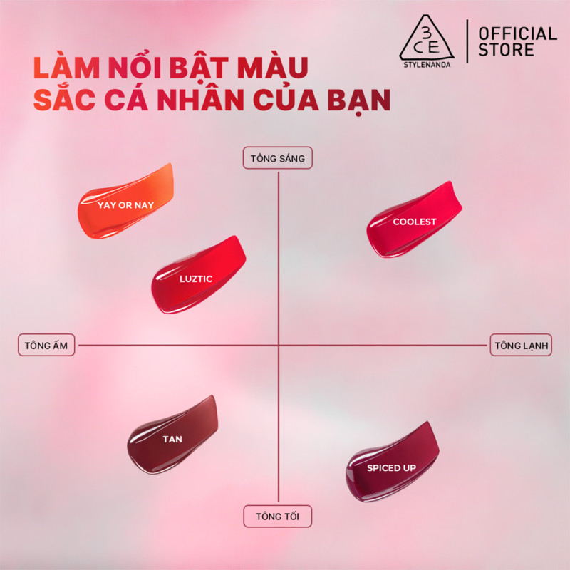 3CE (3 Concept Eyes) là thương hiệu mỹ phẩm nổi tiếng thuộc Stylenanda – Hàn Quốc. Dòng sản phẩm của 3CE luôn đi đầu xu hướng nhờ thiết kế thời thượng, chất lượng vượt trội và bảng màu thời trang.