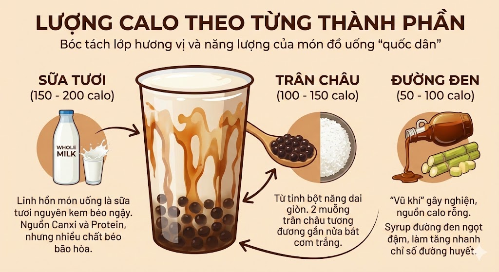 - Sữa tươi (150 – 200 calo): Linh hồn của món uống thường là sữa tươi nguyên kem béo ngậy (như Dalat Milk hoặc sữa thanh trùng). Dù cung cấp nguồn Canxi và Protein dồi dào cho phái đẹp, nhưng đi kèm đó là một lượng chất béo bão hòa đáng kể.