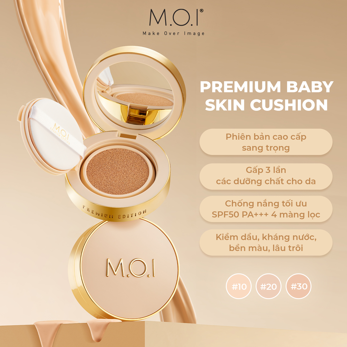 Phấn nước M.O.I Premium Baby Cushion SPF 50+ PA+++ 12g – Dòng cushion thuộc phiên bản giới hạn nhân dịp kỉ niệm 5 năm truyền cảm hứng làm đẹp của M.O.I với thiết kế trẻ trung và năng động hơn. Chứa chỉ số chống nắng cao SPF50+ PA+++ cùng với chất chống oxy hóa và các thảo dược quý hiếm cho làn da hoàn hảo.